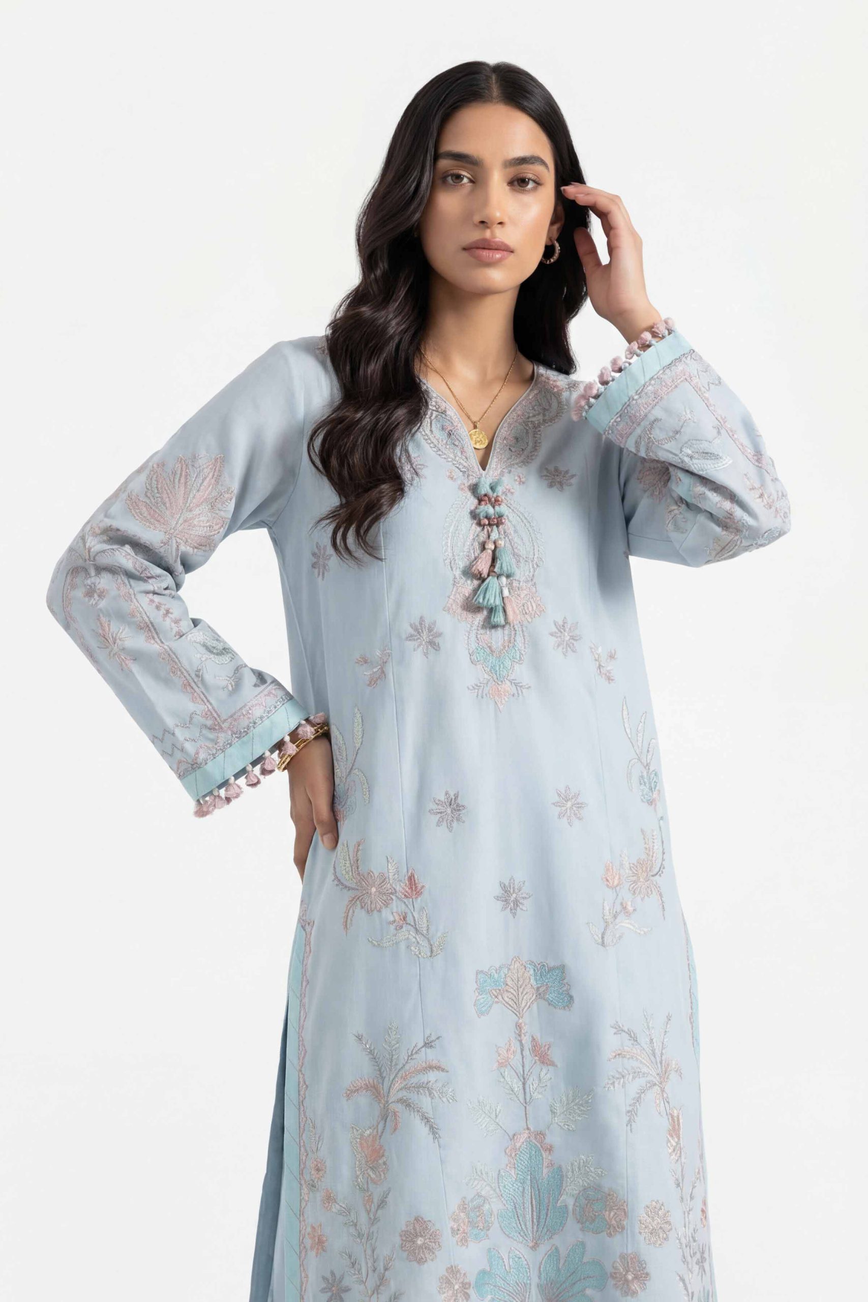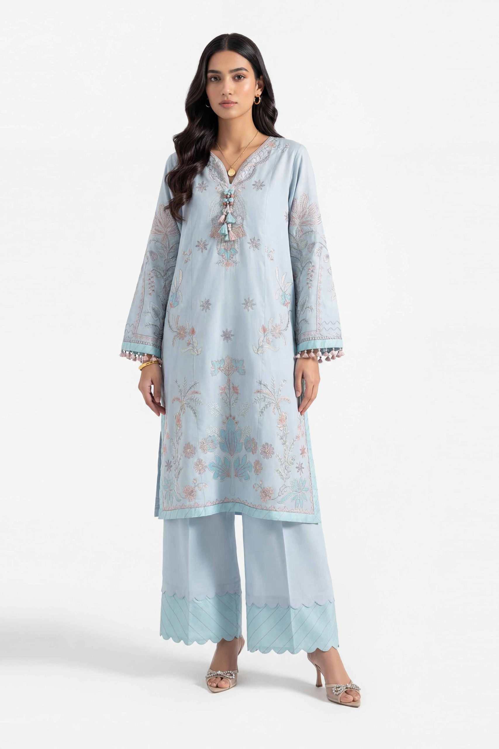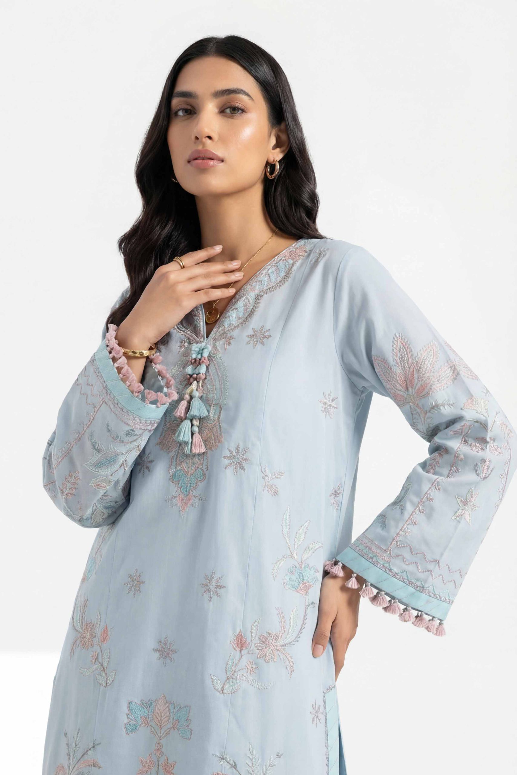 Product Detail: Floral Style Shirt with Trousers SHIRT Embroidered Solid Fine Lawn Shirt Front Center Panel: 1 Piece Embroidered Solid Fine Lawn Shirt Front Side Panel: 2 Piece Embroidered Solid Fine Lawn Shirt Sleeves: 2 Piece Solid Fine Lawn Shirt Back: 1 Piece Embroidered Border: 1 Piece Fabric: Lawn Color: Ice Blue TROUSERS Solid Cambric Trouser: 2.5 Meter Fabric: Cambric Color: Ice Blue Note: Product color may slightly vary due to photographic lighting sources or your device settings.